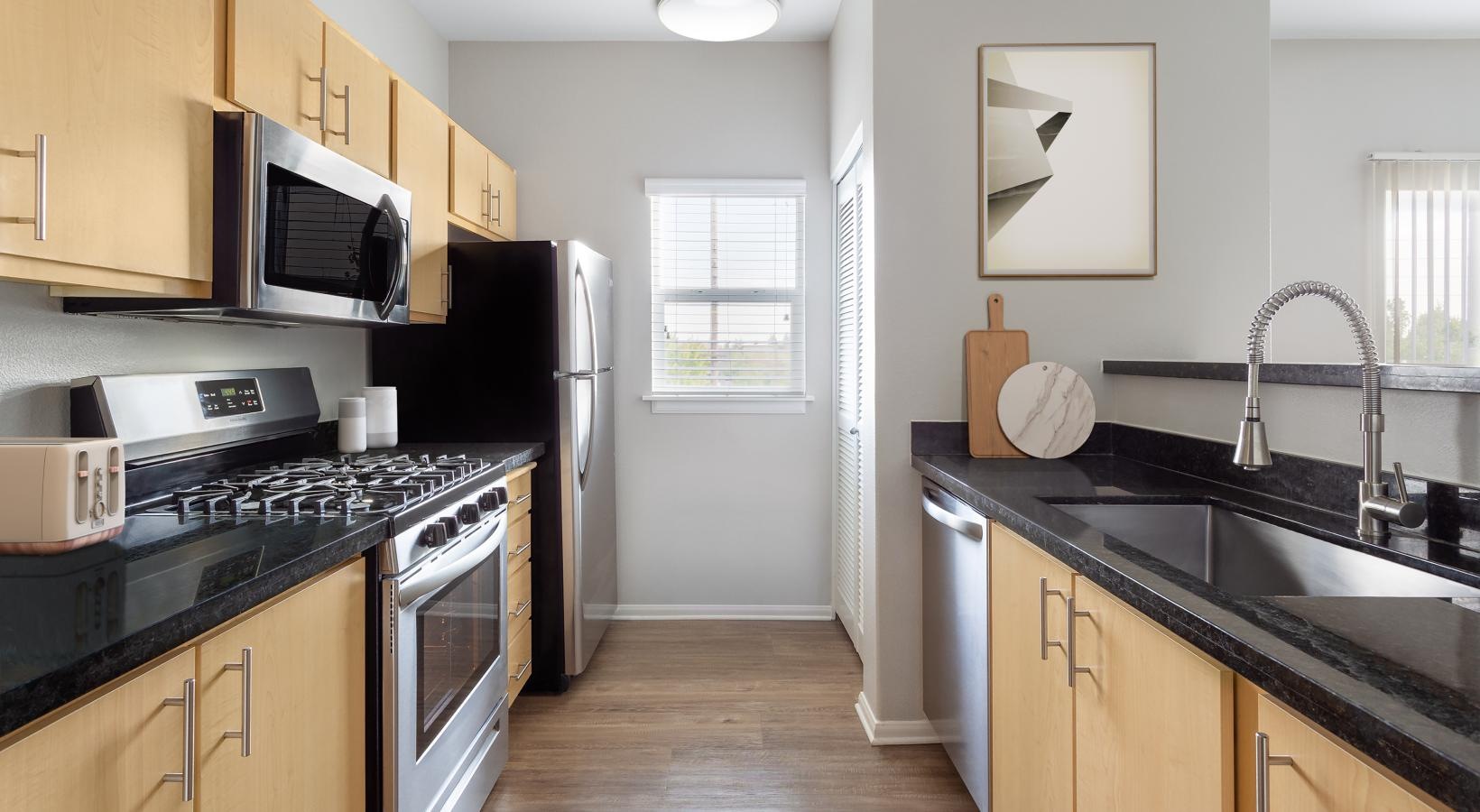 • a kitchen with wooden cabinets