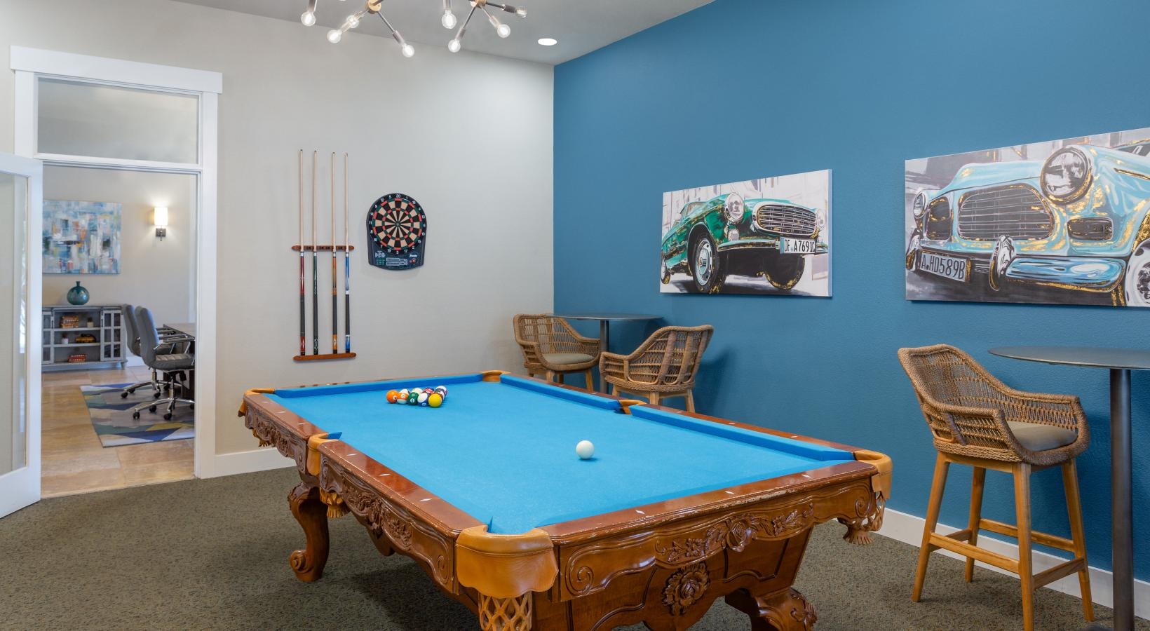 • a pool table in a room