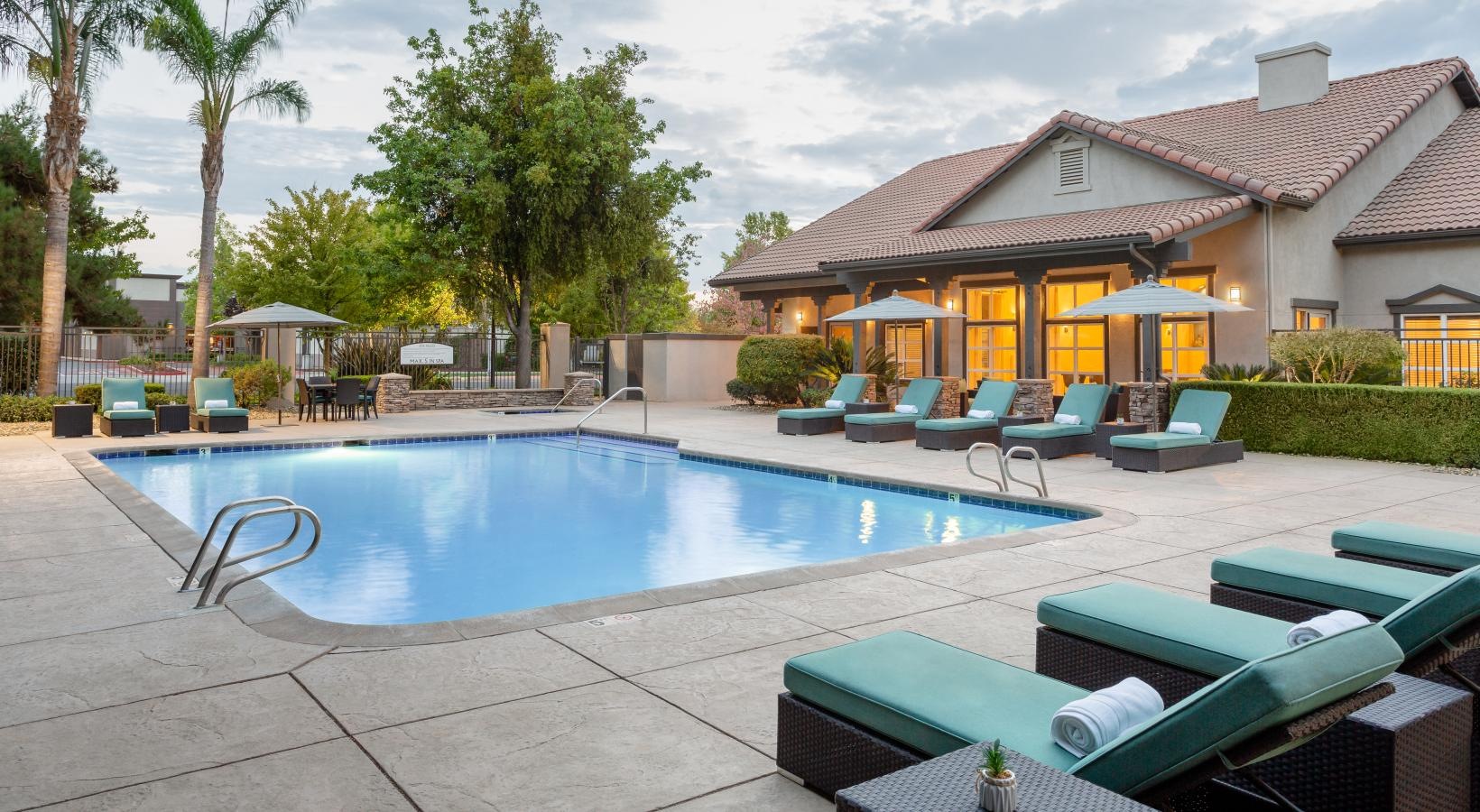 • a swimming pool with chairs around it